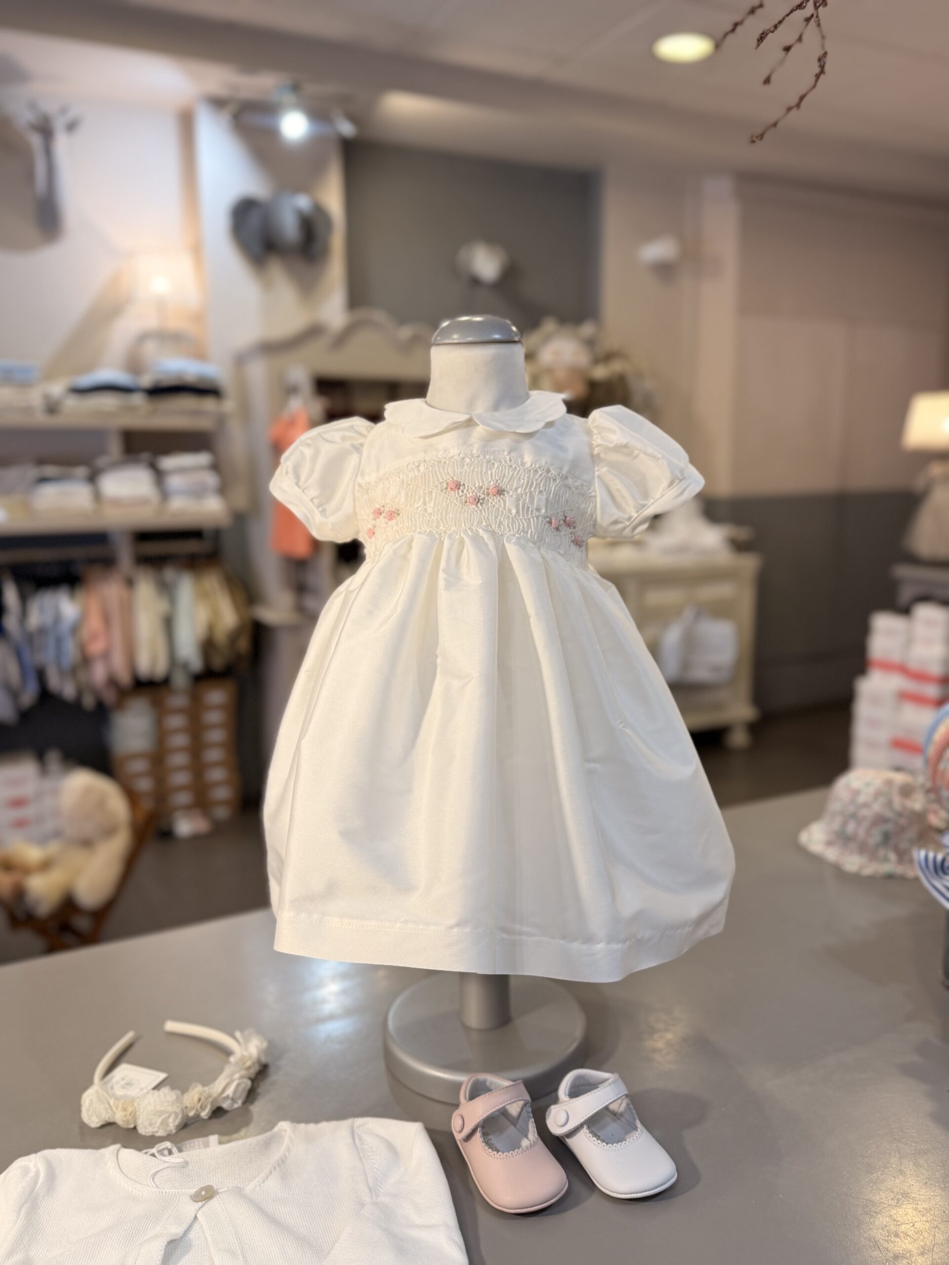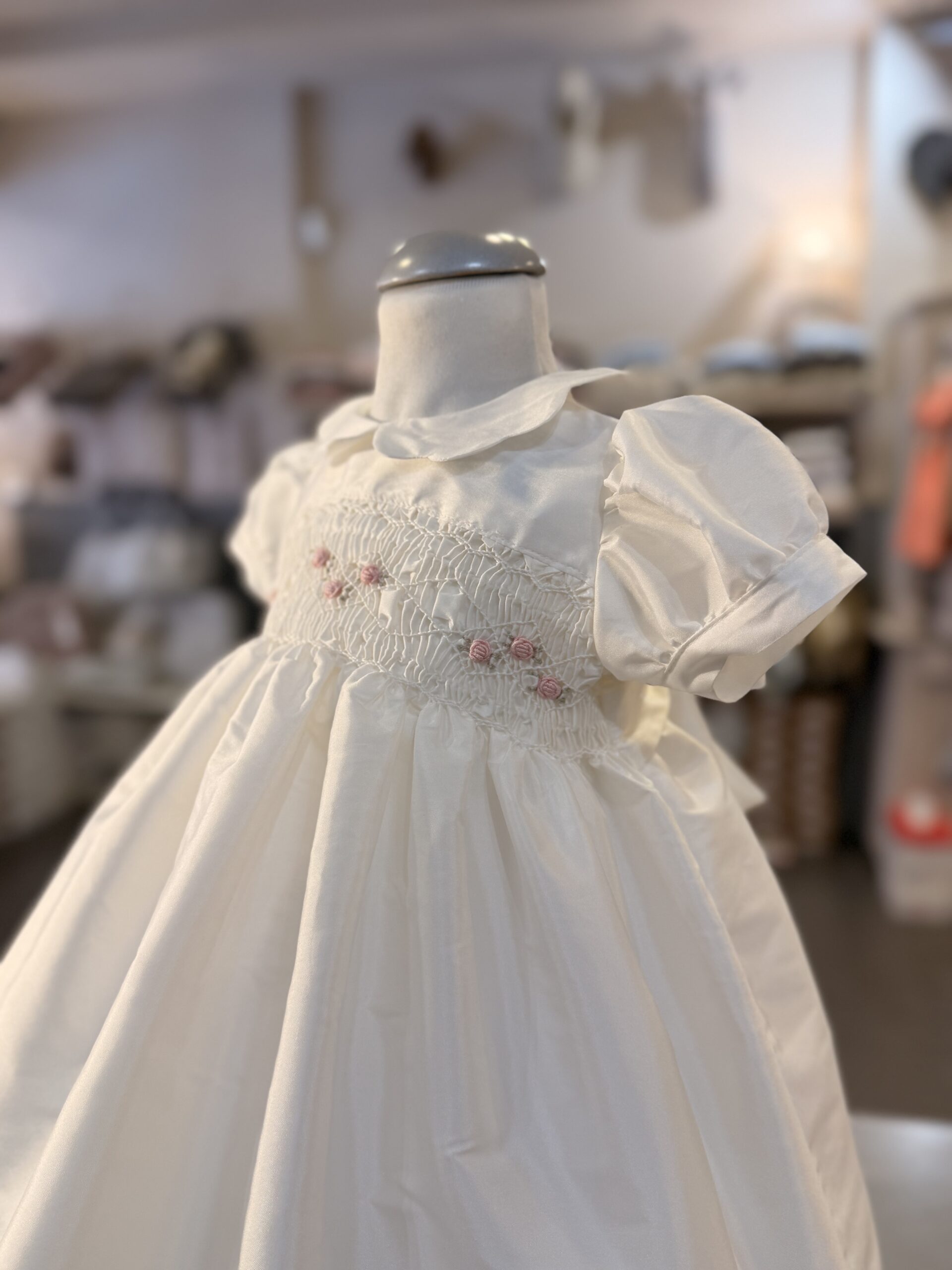 Meraviglioso abito da battesimo in seta con ricamo a punto smock e roselline a vapore interamente eseguite a mano, Brand Mariella Ferrari