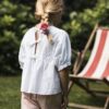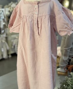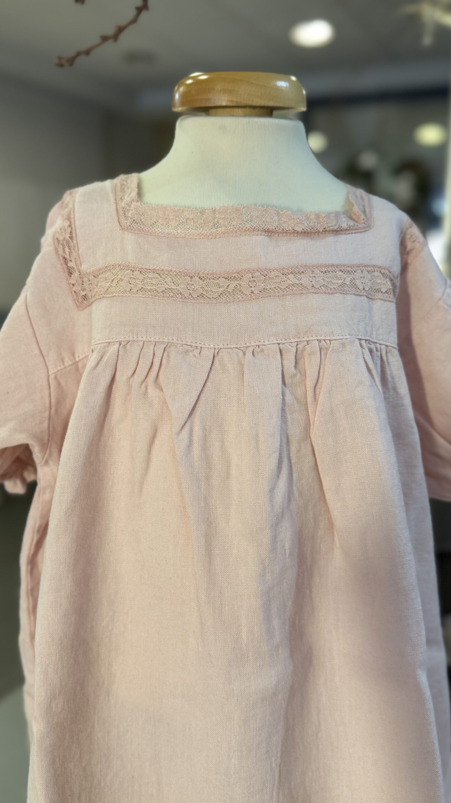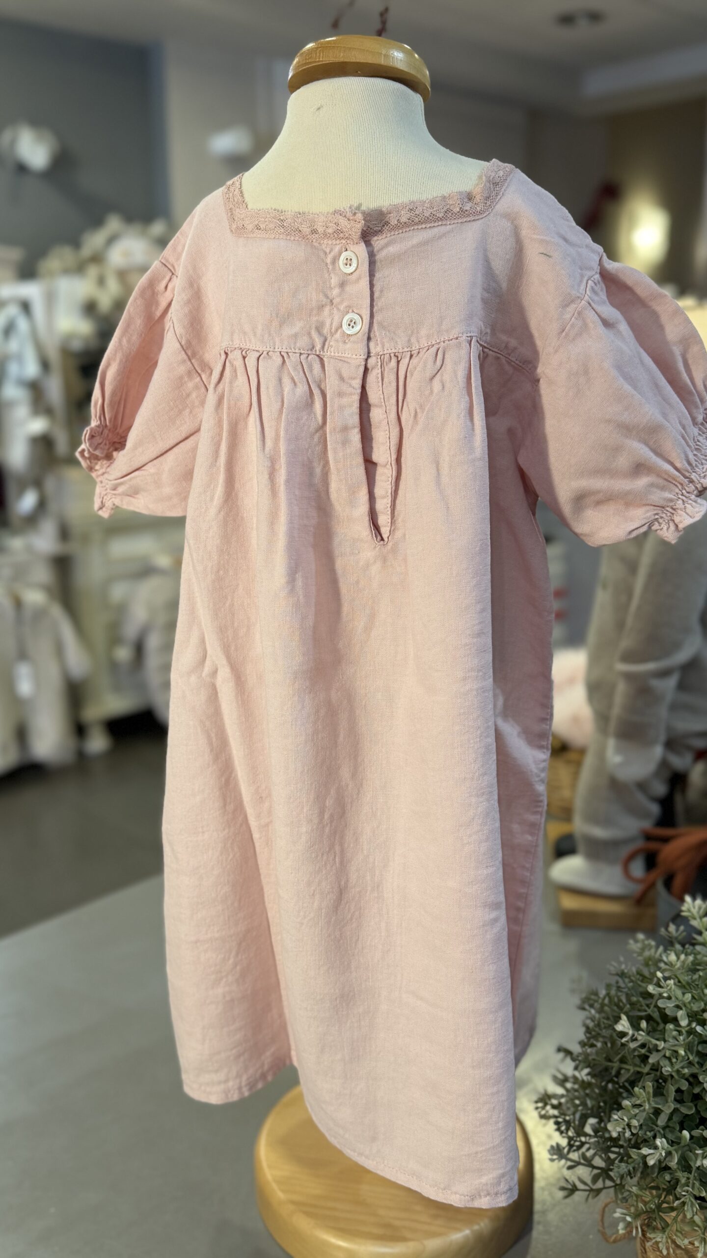 abito in lino rosa  con pizzo , e bottoncini sulla schiena .