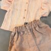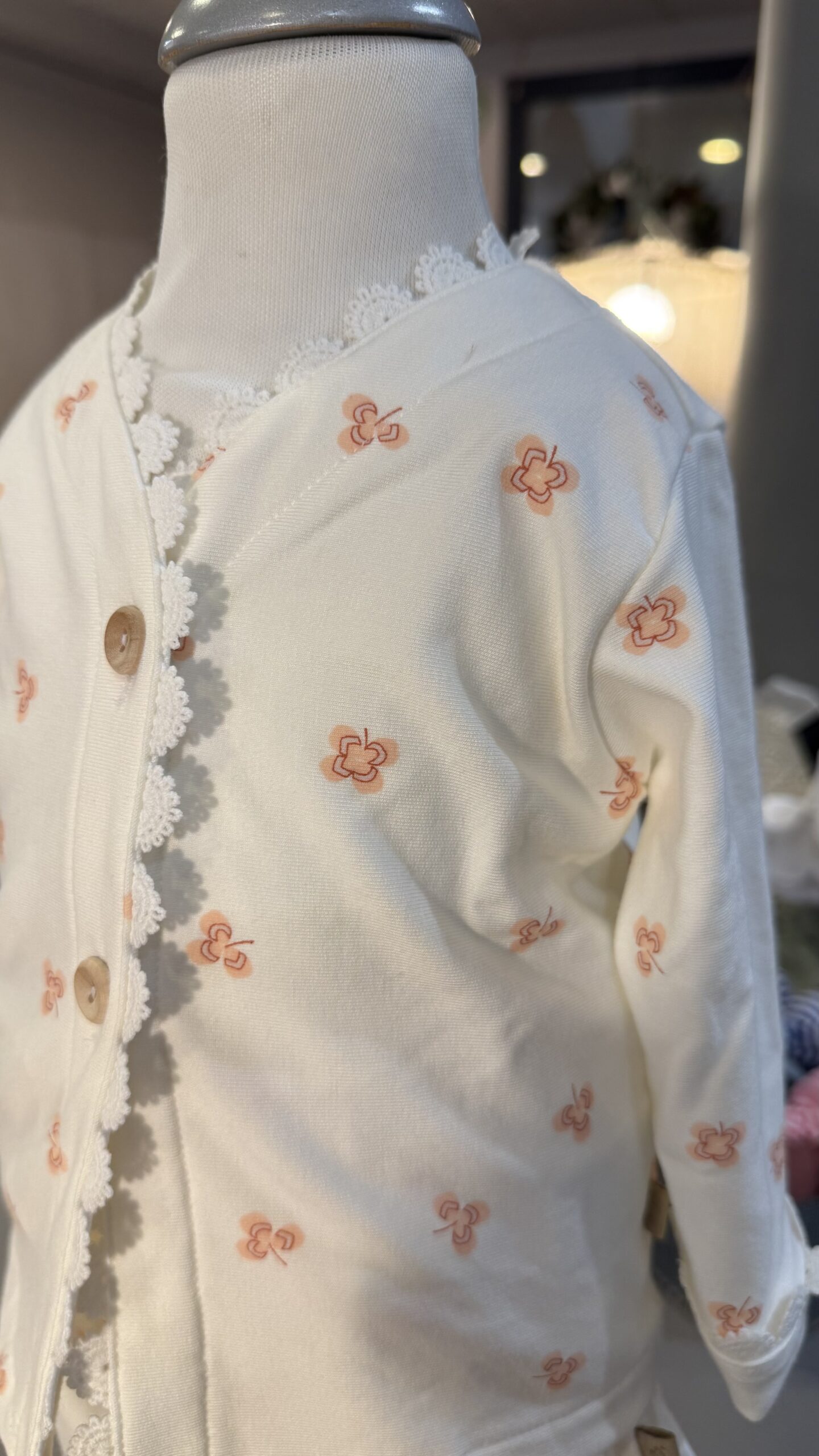 cardigan in jersey panna con fiorellini rosa arancio e pizzo in tutto il profilp, Bamboom