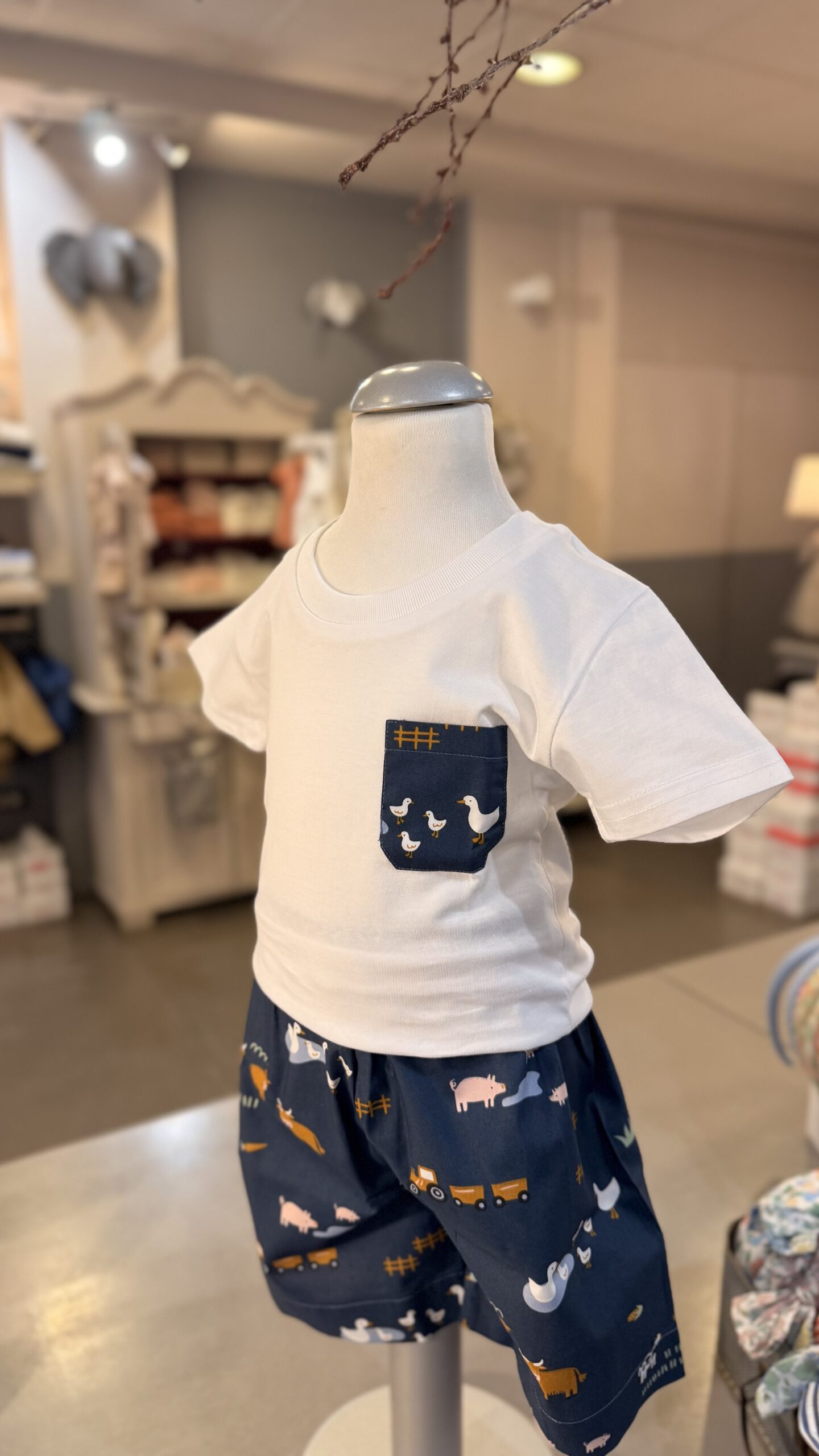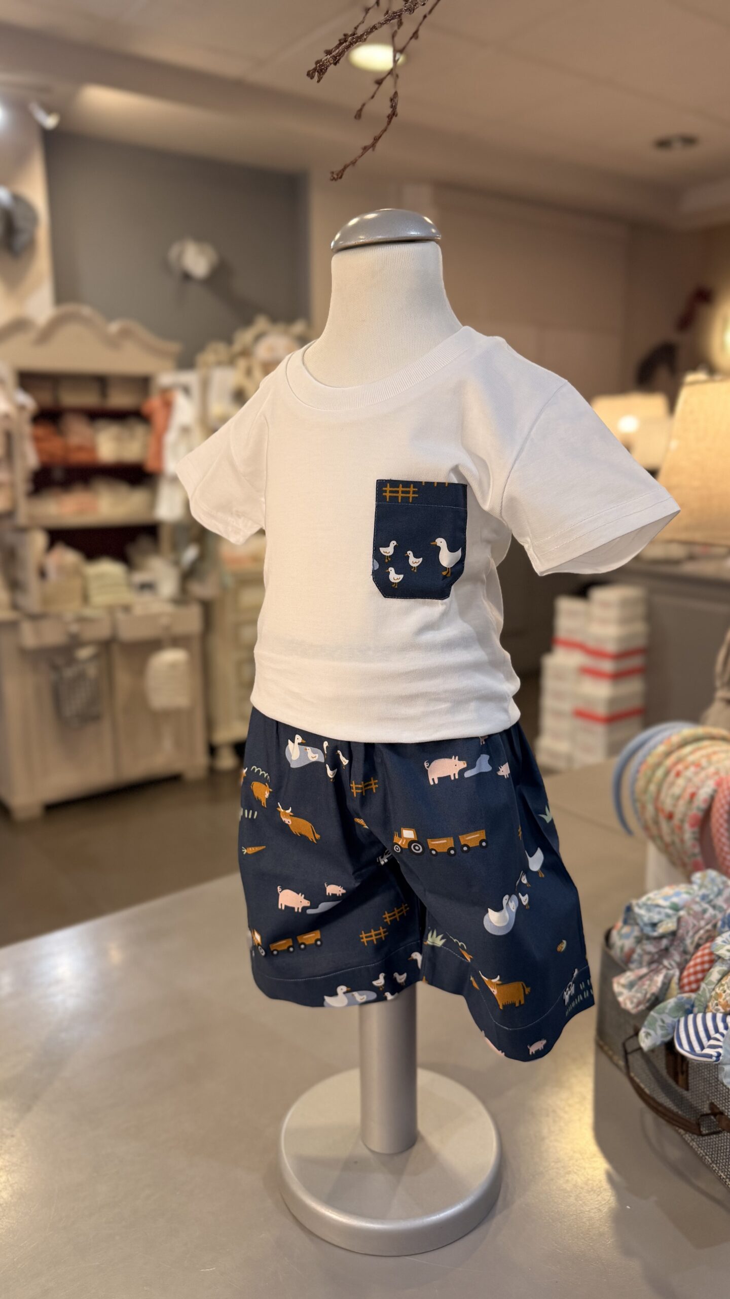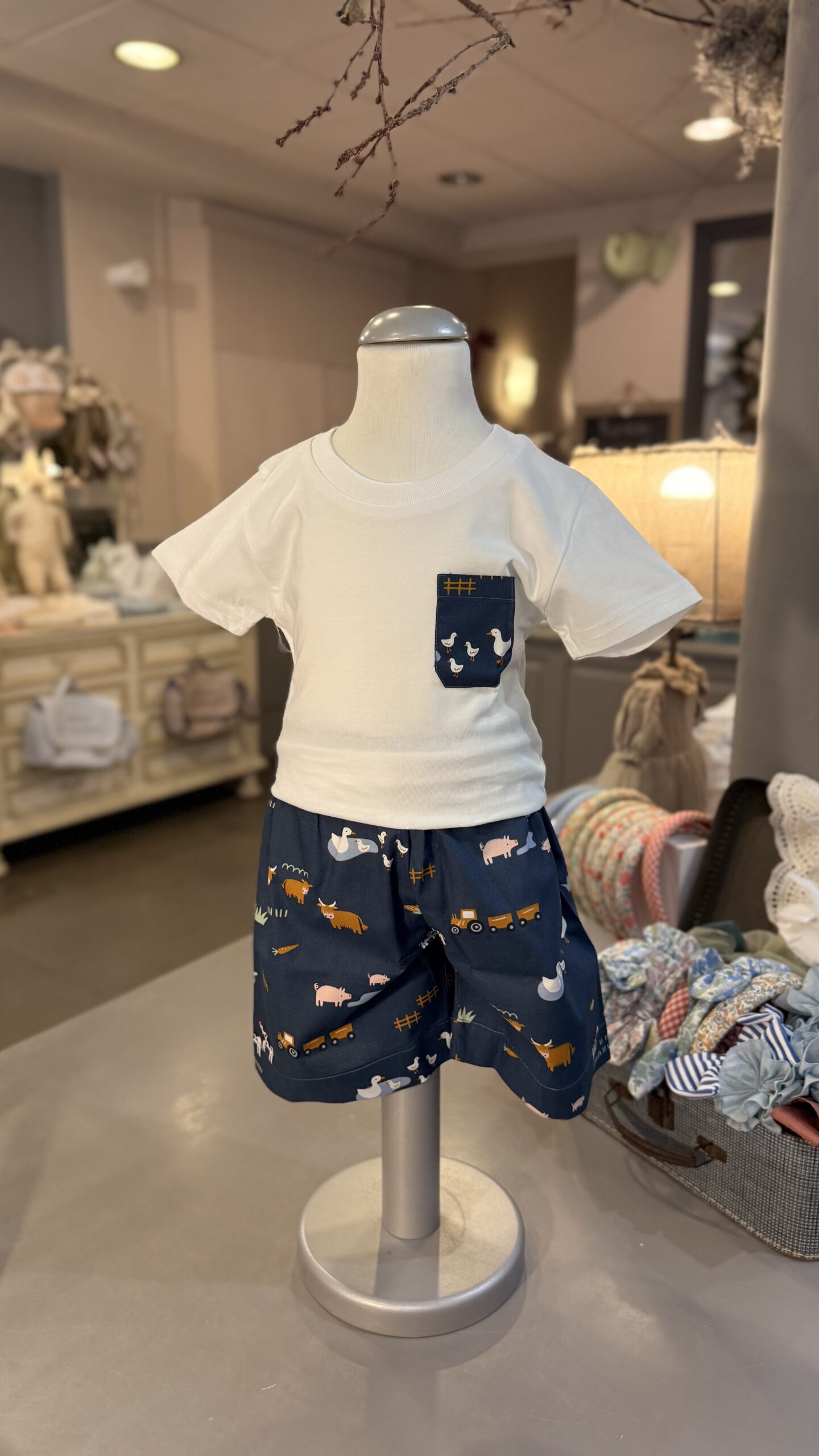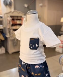 Completo composto da tshirt con taschina fantasia fattoria bermuda elasticato in vita , con taschina sul dietro. Brand Pepece’