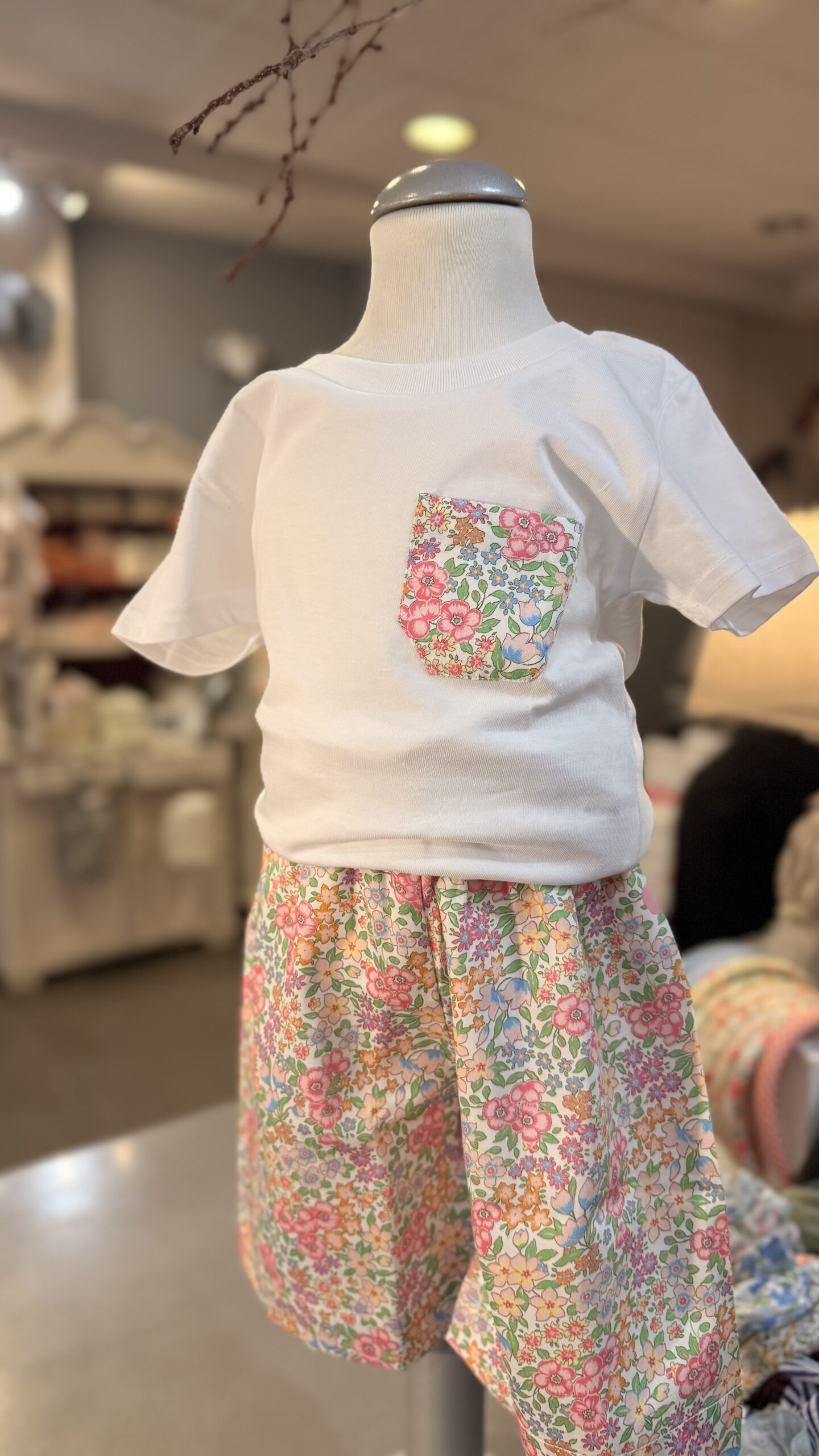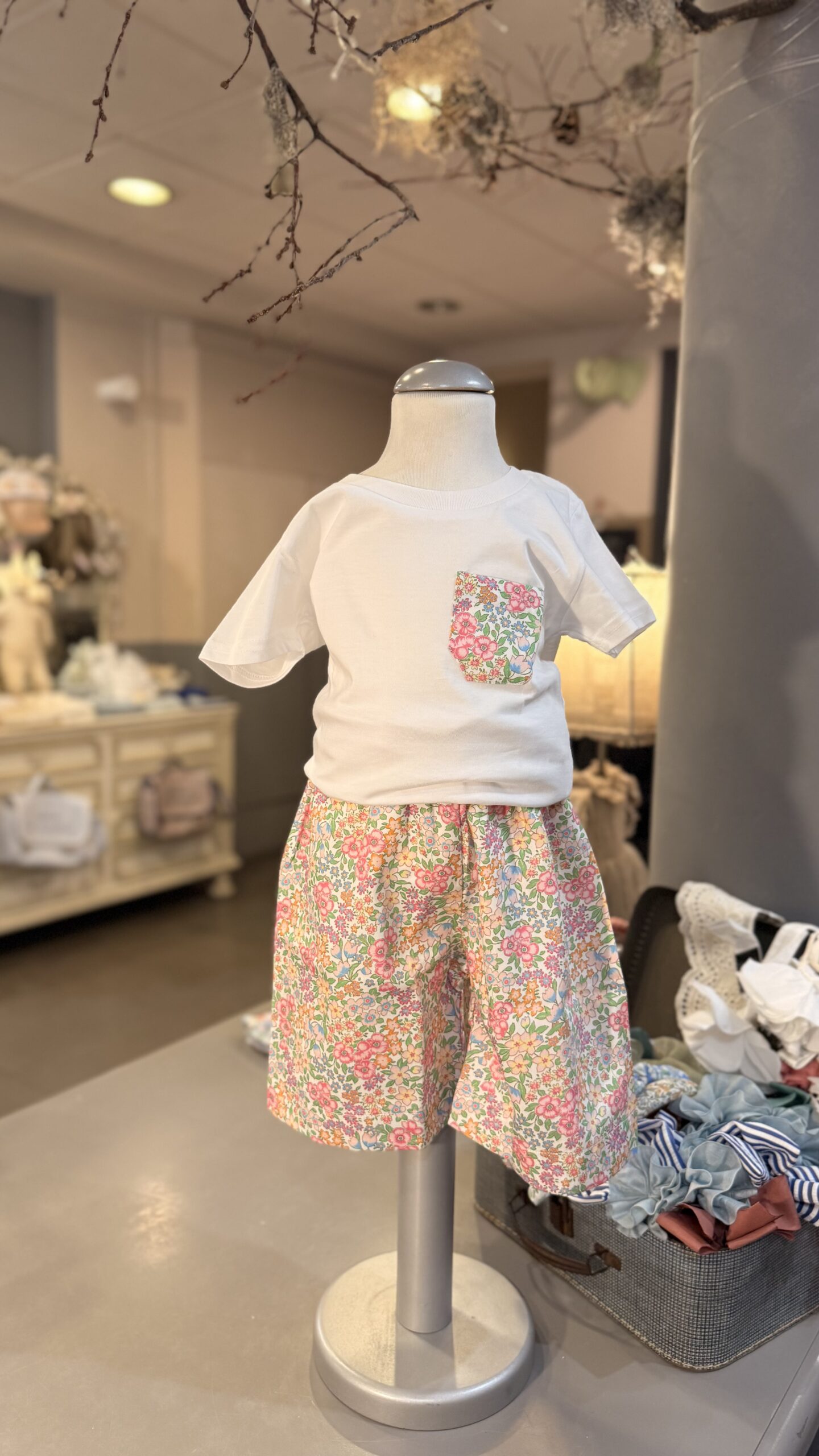 Completo composto da tshirt con taschina a fiori e bermuda elasticato in vita , con taschina sul dietro. Brand Pepece’