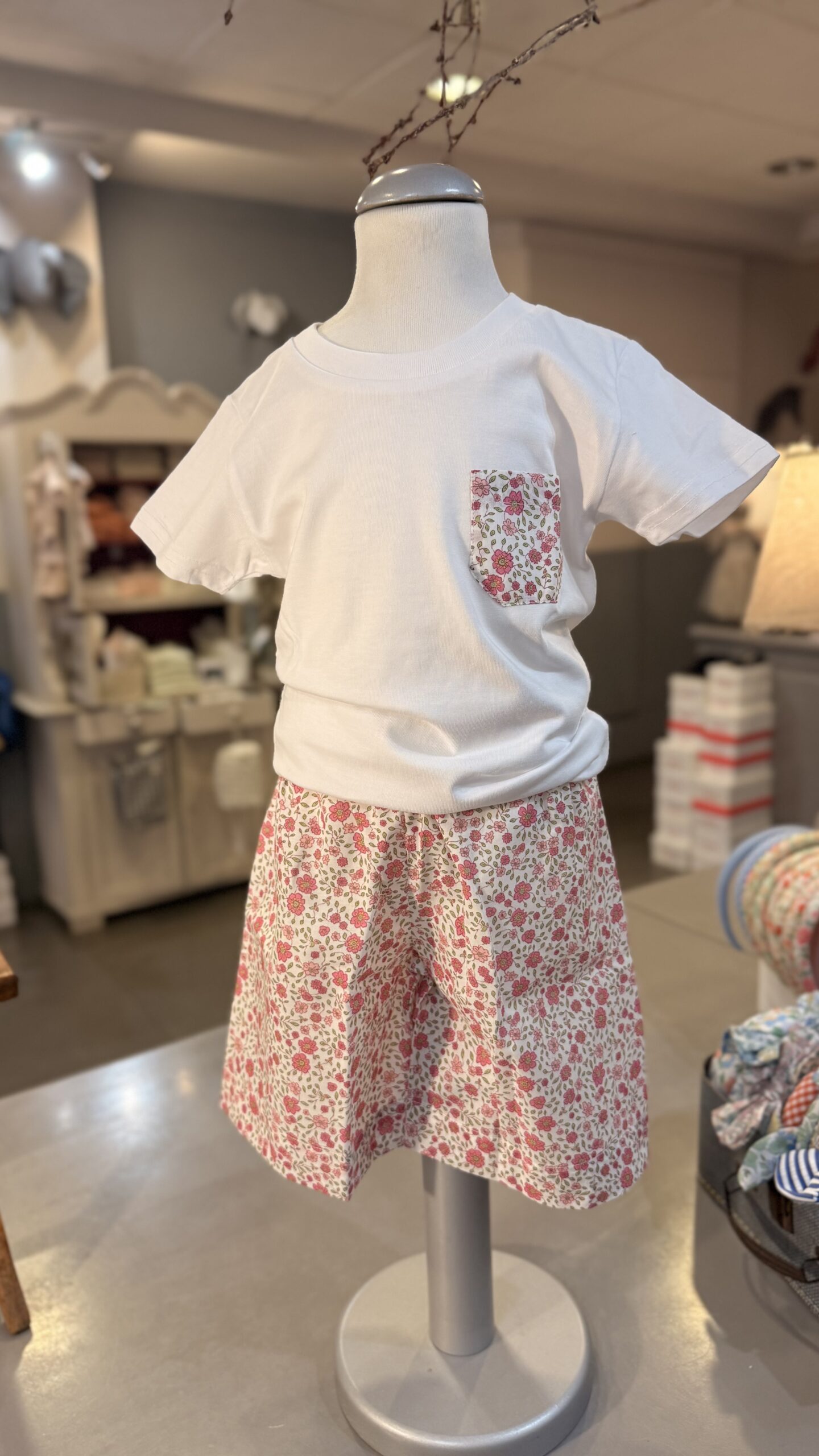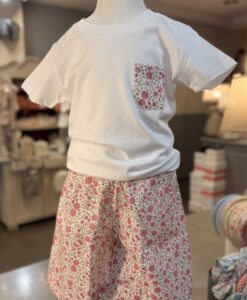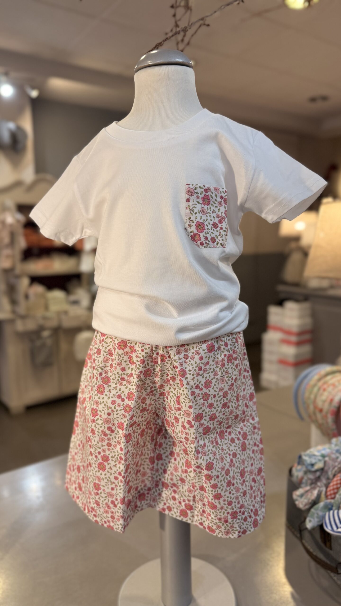 Completo composto da tshirt con taschina a fiori e bermuda elasticato in vita , con taschina sul dietro. Brand Pepece’