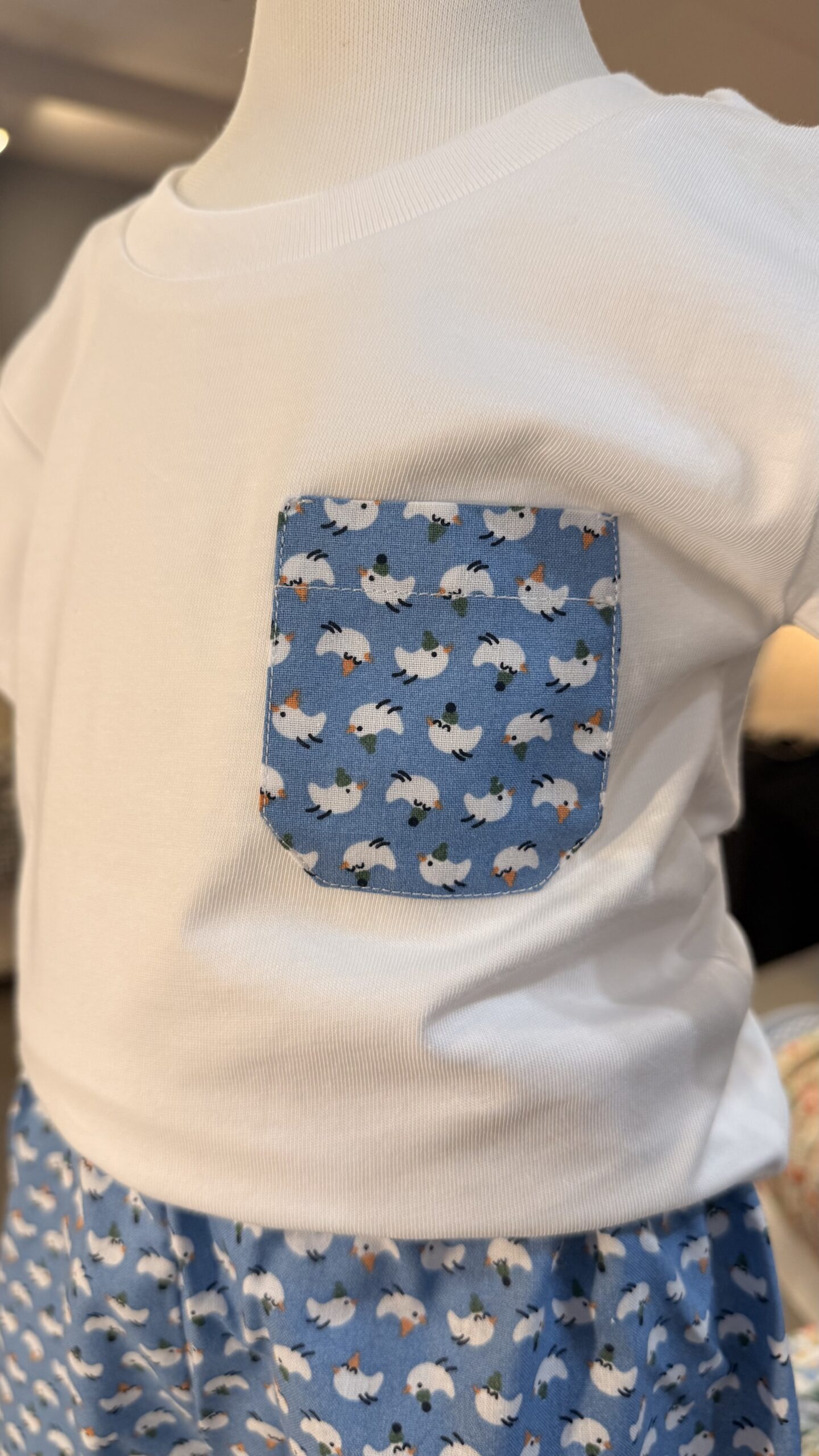 Completo composto da tshirt con taschina fantasia pulcinii e bermuda elasticato in vita , con taschina sul dietro. Brand Pepece’